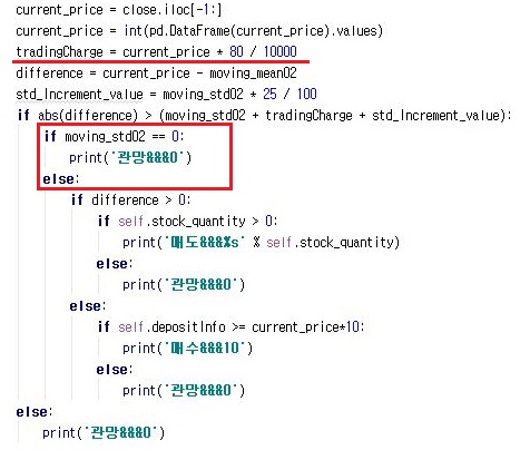 그래서 먼저 수수료의 계산을 80%로 올리도록 했으며, 다음으로는 표준편차가 0인 경우에는 모두 관망으로 처리가 되도록 만들도록 했습니다.
