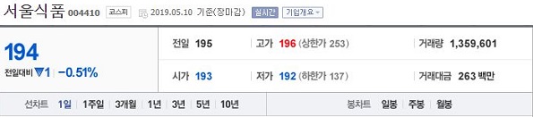 다음은 서울식품의 주식이 나왔습니다. 다만 이 종목에 대해서는 거래량이 많기는 한데, 왜인지 모르게 주가의 가격 자체가 지나치게 낮은 것이 아닌가 하는 생각이 듭니다.
