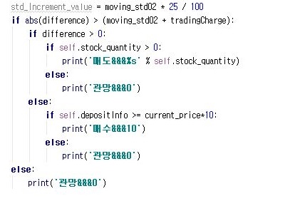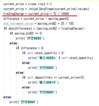 그리고 나서 한번 계산을 할 때, 증가하는 가격분을 제외시켜서 계산에 들어가 보도록 했습니다. 이렇게 하는 것으로 이전과는 더 많은 거래가 일어날 것으로 나오리라 기대를 하고 있습니다. 그리고 이전에 있었는 분산이 0일때 무조건 관망을 하게 만드는 구문을 제거를 했습니다.