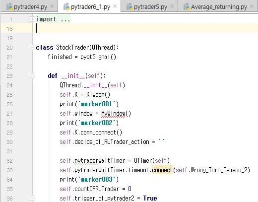 그래서 일단 새로 만든 py파일에다가 실제로 주식을 거래하는 코드를 복사해서 붙여넣기를 해 주도록 합니다. 그리고 여기서에서는 표식도 찍어 줍니다.