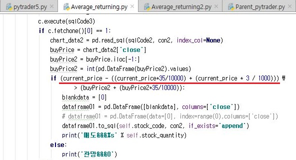 먼저 위스크린샷에 보이는 것처럼 매도를 할 경우 현재가가 모의투자에 사용이 되는 수수료율 0.35%를 상쇄할 정도로 충분히 높이 올라가지 않으면 기존엔느 거래를 하지 않도록 했는데, 여기다가 이제 거래세인 0.3%를 추가해 보도록 합니다.