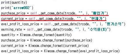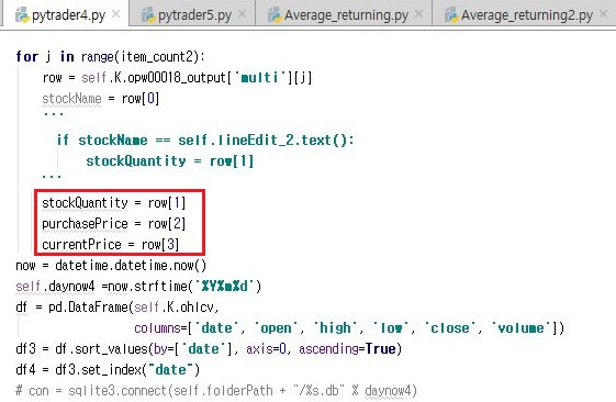 먼저 기존의 pytrader4로 가서, 전에는 보유하고 있는 주식의 양만 가지고 오는 것으로 했습니다만, 이번에는 매입가와 현재가도 가지고 오도록 바꾸어 줍니다.