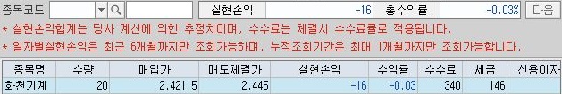 일단 일별 종목별 손익계산서를 영웅문4라는 키움증권 HTS에서 펴 보니까, 여기서는 손실을 기록한 것을 볼 수 있었습니다.