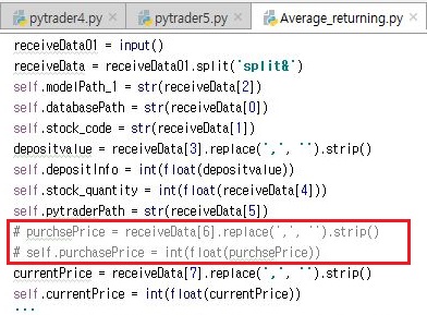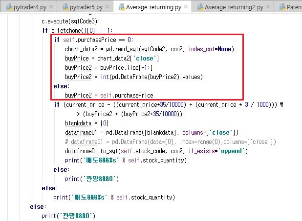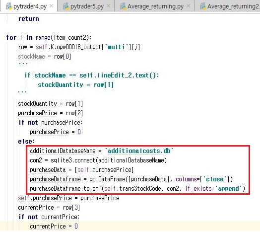 다음으로는 위 스크린샷에서 볼 수 있는 것처럼 Average_returning에서 붉은 박스 안에 있는 내용처럼 먼저 주석처리된 매입가 항목을 해제하고, 여기서 공백-왜 공백이 되느냐 하면, 주식을 1주도 보유하지 않아서 매입가가 없거나, 혹은 모의투자 계좌정보까지 업데이트가 늦어지거나 하는 일이 일어날 경우, 매입가를 기존의 additionalcosts.db에서 찾도록 하고, 그렇지 않다면, 매입가는 부모 프로세스가 보내온 데이터를 바탕으로 하도록 했습니다.
