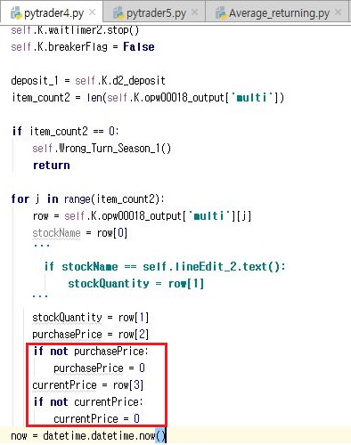 다음으로는 위 스크린샷에서 나와 있는 것처럼, 매입가나 현재가가 공백일 경우도 대비해 보도록 합니다. 왜 이렇게 하느냐 하면, 먼저 계좌정보에서 매입가와 현재가는 나오지 않을 수도 있기 때문에, 이는 상당히 심각한 결과를 초래할 수도 있기 때문입니다.