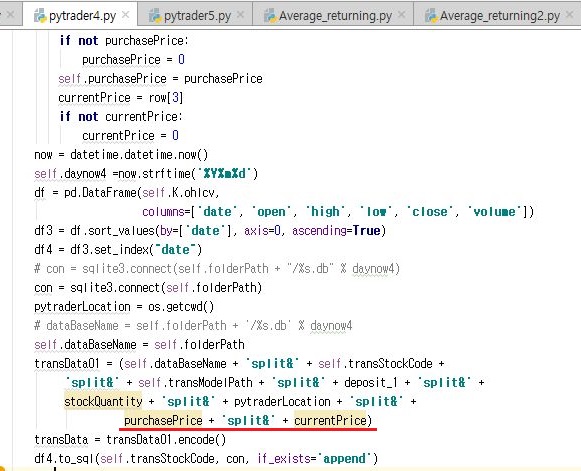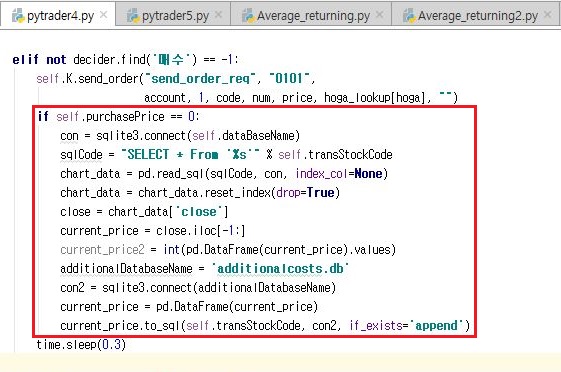 그리고 다음으로 해야 할 일은 pytrader4에서 만약에 매수라는 명령이 나오게 되면, 여기서는 가지고 온 self.purchasePrice가 0인 상황 = 즉, 서버에서 넘겨받은 매입가의 정보가 없는 상황이라면 여기서 현재가를 그대로 additionalcosts.db에 저장을 하도록 명령합니다.