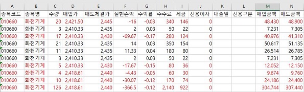 그런데 유감스럽게도, 이렇게 매입가를 가지고 오는 코드를 짜는데 너무 시간일 허비한 탓인가요? 이제는 주식시장이 막을 내려서 그전에 나온 거래를 정리해 보았습니다. 위 스크린샷에서 붉은글씨 처리가 된 부분은 손해보는 거래를 한 부분입니다.
