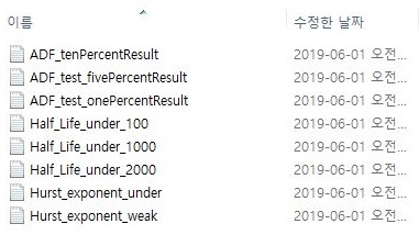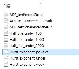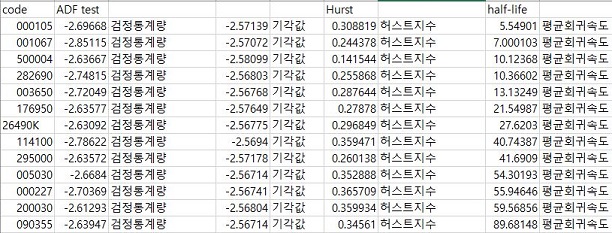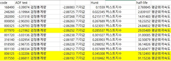 먼저 FirstClass입니다. ADF 테스트에서 가장 까다로운 규칙을 통과했고, 그외에 허스트 지수와 반감기 테스트에서 제가 설정한 수치 아래로 나온 값들입니다.