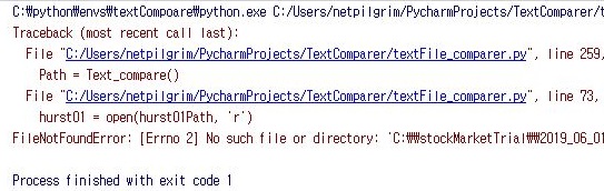 그런데 위 스크린샷에서 볼 수 있듯이 에러가 하나 뜨는 것을 볼 수 있었습니다. 이 에러가 왜 떴느냐 하니까, 허스트 테스트에서 계속해서 상승하는 경향을 보인 주식이 한주도 없어서, txt파일이 생성되지 않아서 생긴 문제였습니다.