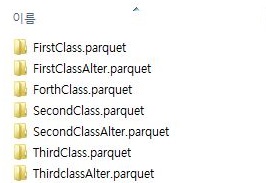 그 결과 위 스크린샷에서 볼 수 있듯이 파케이 형식의 파일들이 폴더에 하나하나 담겨서 생성이 된 것을 볼 수 있습니다. 원래는 프로젝트가 있는 폴더에서 생성이 된 것이기 때문에, 모두 다른 폴더로 옮기도록 합니다.