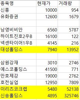 먼저 대성홀딩스와 이리츠코크렙과 같은 회사들이 1주당 1000주를 넘어가고 해서 모의투자에 적합한 것으로 나왔습니다. 그리고 나서 신송홀딩스의 경우에는 거래량이 압도적으로 많은데, 문제는 Half-Life 테스트에서 가장 큰 값을 얻었기 때문에, 평균으로 돌아가기 위해선 많은 시간이 들어갈 것으로 보입니다.