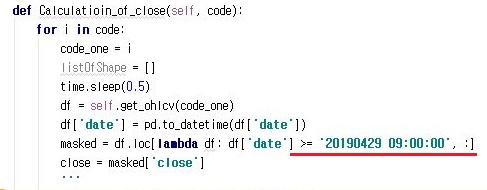 먼저 모든 코스피 종목을 긁어와서 테스트를 하기 위해서, 어느날짜 이후의 데이터만을 지정할 것이냐를 결정해야 하는데, 위 스크린샷에서 볼 수 있는 것과 같이 2019년 4월 29일 오전 9시 이후의 데이터만을 사용하도록 합니다.