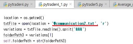 다음으로는 communication2.txt를 읽도록 pytrader4_1.py의 코드를 변경해 보도록 합니다. 이 작업은 여기서만 끝이 나는 것이 아니기는 합니다.