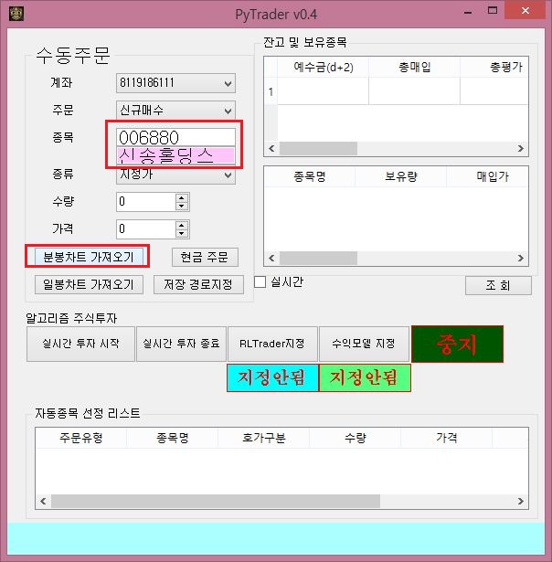 다음으로는 여기서 새로이 작업을 하기 위해서 만들어 놓은 신송홀딩스의 주식을 한번 가지고 오도록 해 봅니다. 여기서도 역시 pytrader.py를 실행시켜서 얻었습니다.