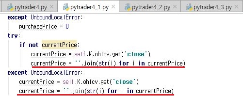 그런데 하나 실행하던 도중에 에러가 발생하는 것을 볼 수 있었습니다. 다행이도 매수 결정을 하는 와중에 나오는 에러였기 때문에, 지금 발견된 것이 다행이라는 생각이 들었습니다. 에러의 내용은 변수하나가 미리 정의되지 않은 상황에서 if문에서 사용이 된 것 때문에, __init__()에 미리미리 변수를 정의해 주도록 합니다.
