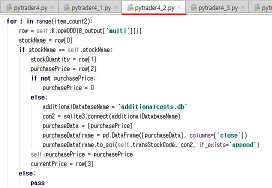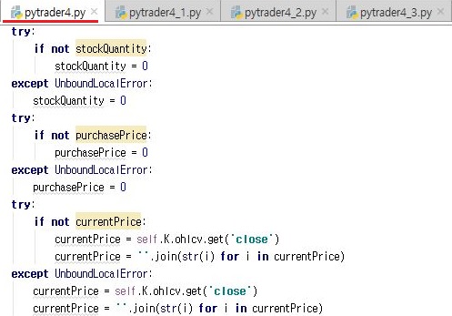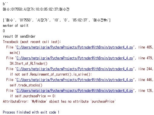 그런데 하나 실행하던 도중에 에러가 발생하는 것을 볼 수 있었습니다. 다행이도 매수 결정을 하는 와중에 나오는 에러였기 때문에, 지금 발견된 것이 다행이라는 생각이 들었습니다. 에러의 내용은 변수하나가 미리 정의되지 않은 상황에서 if문에서 사용이 된 것 때문에, __init__()에 미리미리 변수를 정의해 주도록 합니다.