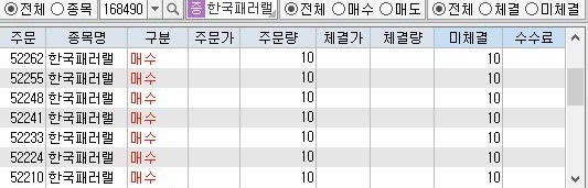 거기다가 왜 이리도 매수가 많이 일어나는지 이제 알 수 있었습니다. 한국 패러랠의 주식이 매수 주문을 낸다고 100% 매수가 되지 않고 미체결 주문이 나오는 경우가 나옵니다. 그런데 프로그램인 이를 모르고 계속해서 매수 주문을 내기 때문에 매수 주문만 15번이나 계속해서 내고, 이후에 주문이 체결되면서 제가 의도한 양 이상의 주식을 보유하게 되는 것 입니다.