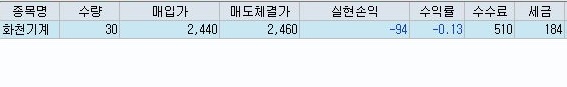 그런데 처음으로 거래가 일어났는데, 문제는 이게 손실을 보았다는 겁니다. 왜 이렇게 되었는지 계산을 해 보니, 2440원인 매입가에서는 매도를 2460원에는 결정을 하지 않습니다. 그런데 왜 이런 일이 일어났느냐 하면, 바로 '미체결'이 된 매도주문이 나온 주식이 낮은 현재가에서 체결이 되면서 이런 에러가 벌어진 것으로 생각이 됩니다.