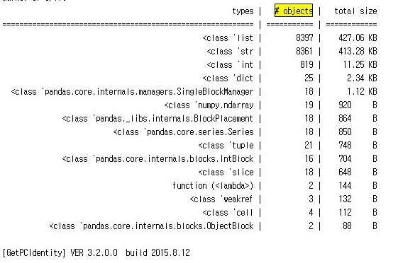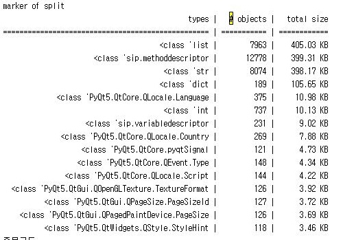 그리고 나서 한번 한개의 사이클이 끝나는 시점에서 이렇게 어디서 메모리를 많이 소모를 하는지 알아보기 위한 SummeryTracker()라는 함수를 사용하고, 그 결과를 출력해 보도록 합니다.