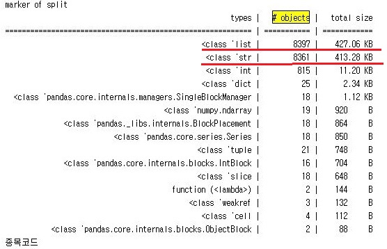 그런데 총 30번의 사이클 중에 15번째에 와서는 위 스크린샷처럼 리스트도 리스트지만, 문자열 데이터도 상당히 많은 양의 데이터를 사용하고 있다는 것을 알 수 있었습니다.