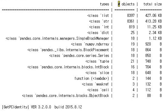 그리고 나서 한번 한개의 사이클이 끝나는 시점에서 이렇게 어디서 메모리를 많이 소모를 하는지 알아보기 위한 SummeryTracker()라는 함수를 사용하고, 그 결과를 출력해 보도록 합니다.