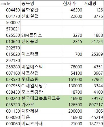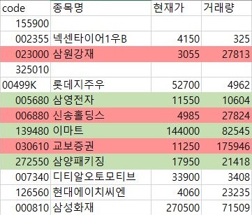 일단 복사 및 붙여넣기를 하는 방식으로 엑셀에 옮기는 데는 성공했습니다. 그리고 나서 어떤 종목들이 모의투자에 적합한지 아닌지를 알아 보고자 합니다.