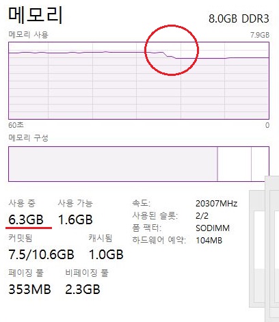 이렇게 해서 실행을 시킨 다음에, 위 스크린샷처럼 한번 작업관리자를 통해서 메모리 사용량을 체크해 보고자 했습니다. 일단 막 시작할 무렵에는 6.4기가를 사용하고 있는 것을 볼 수 있습니다.