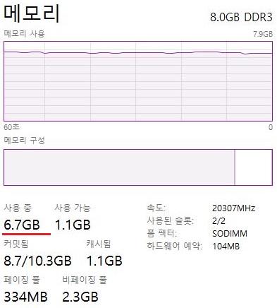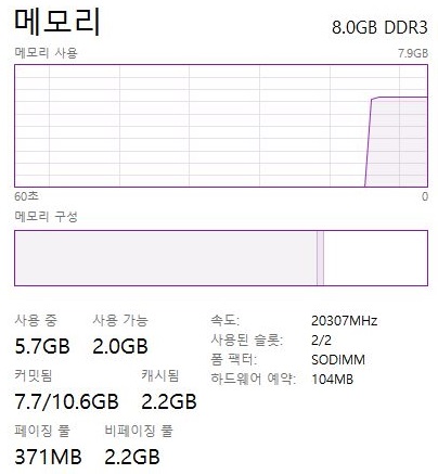 먼저 아무것도 하지 않았을 때의 메모리를 작업 관리자를 통해서 체크하는 상황입니다. 기본적으로 5.7기가의 메모리를 잡아먹고 있는 것을 볼 수 있습니다.