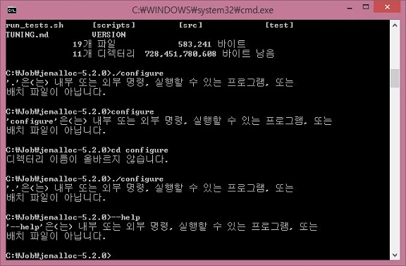 그래서 인터넷에서 jemalloc-5.2.0 을 다운로드 받은 다음에, 이를 한번 위 스크린샷처럼 cmd를 실행시켜서 인스톨 해 보고자 했습니다.