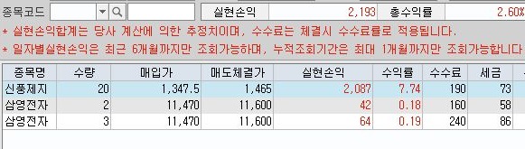 이렇게 해서 모두 이익으로 나왔는데, 어떻게 해서든 간에 수익이 2193원으로 나오는 것을 볼 수 있었습니다. 즉, 중간에 끝까지 가지 않아도, 어찌어찌 해서는 수익이 나오기는 나온다는 것을 알 수 있습니다. 이게 구조적으로 단타매매를 막아놓은 모의투자지만, 그래도 이렇게 해서 수익이 나오는 것을 봐서는, 나중에 실전투자에 들어가서는 어떻게 나올 지 모르겠습니다.