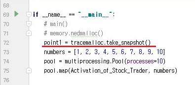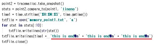 그리고 나서 위 스크린샷처럼 첫 메소드가 시작하기도 전에 한번 tracemalloc을 start() 시키도록 하는 것을 잊으면 안된다는 것 입니다.
