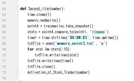 일단 6월 27일 목요일의 모의투자가 메모리 문제를 잡는다고 아무런 성과도 없이 끝났지만, 그래도 일단 계속해서 시도를 하기는 해야 하기 때문에, 일단 한번 계속해서 작업을 이어 나가도록 합니다. 이번에는 tracemalloc이라는 파이썬의 내장 모듈을 활용해서, 어디서 메모리를 계속 잡아먹는지, 정확히는 계속 커지는 지를 테스트 해 보려고 합니다.