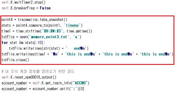 그리고 나서 계좌정보를 얻어오기 위한 코드 바로 직전에도 한번 비교 포인트를 박아 주는 것으로 해서, 계속해서 메모리 사용량을 비교해 봅니다.