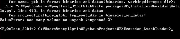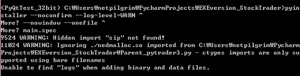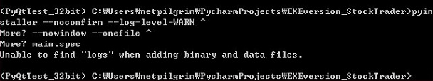 그리고 나서 위 스크린샷과 같이 한번 관리자 권한을 부여하지 않았지만, 일단 onefile로 만드는 옵션을 주어서 한번 만들어 보는 것으로 했습니다. 그러자 이번에는 unicodeescape라는 에러는 사라졌지만, logs를 찾을 수 없다는 새로운 에러에 직면하게 되었습니다. 잘 보면, c-type의 라이브러리 때문에 일어나는 에러라고 합니다.