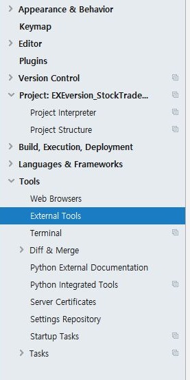 그래서 찾아보니, 파이참에서 external tools라는 메뉴에서 pyinstaller를 지정하면 큰 수고를 들이지 않고도 exe파일로 빌드 할수 있다고 합니다. 일단 settings 항목으로 가서, 외부 도구 항목을 열도록 합니다.