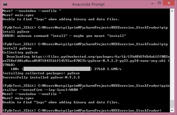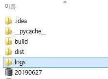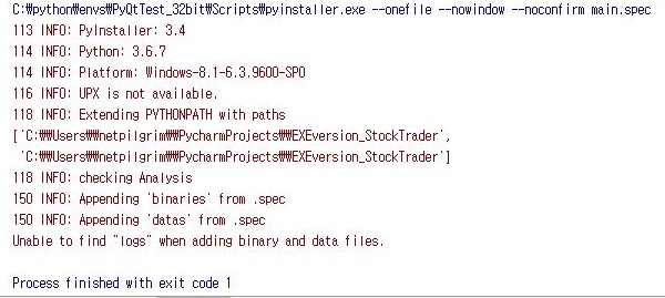 한번 파이참에서 pyinstaller를 실행시켜 보기는 보았습니다만, 그 결과가 그렇게 좋지는 않았습니다. 여기서도 여전히 logs가 없다고 해서 문제가 되는 것을 볼 수 있었습니다.