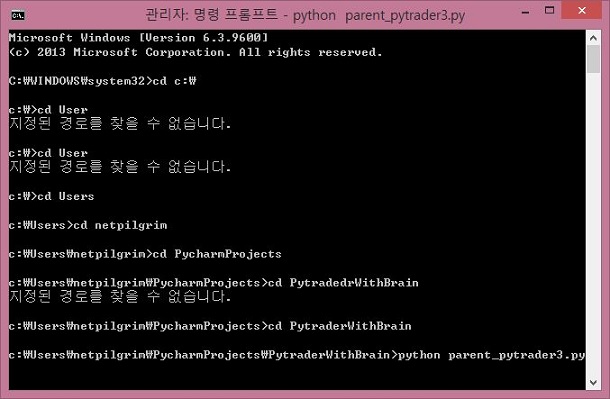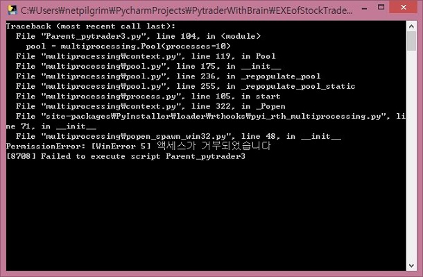 결국 문제가 있는 방법인 python parent_pytrader3.py를 타이핑해서 실행을 시키는 수 밖에 없었습니다. 그러나 이렇게 하고서도 문제가 하나 있었는데......