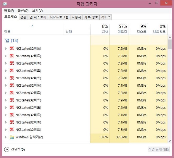 그래서 작업관리자의 프로세스 항목을 유심히 보다보니, Open API가 이상하게 작은 메모리를 차지하지만, 이 프로세스가 종료되지 않고 쌓이면서 메모리를 잡아먹고 있다는 것을 볼 수 있었습니다. 이제까지 메모리 부족의 원인이 다른데 있다는 것을 알 수 있었는데, 문제는 이걸 어떻게 자동으로 잡아 주느냐 하는 것 입니다.