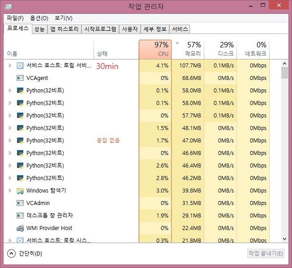 그리고 나서 위 스크린샷처럼 일단 15분이 지나고 나서, 처음에는 위 스크린샷처럼 32비트로 설정이 되어 있는 python.exe들이 종료되지 않고 남았거나, 계속해서 메모리 사용량이 커지는 것으로 생각을 했습니다.