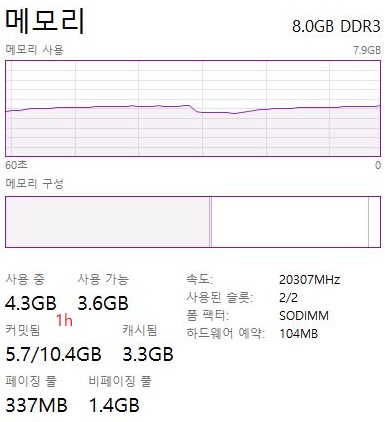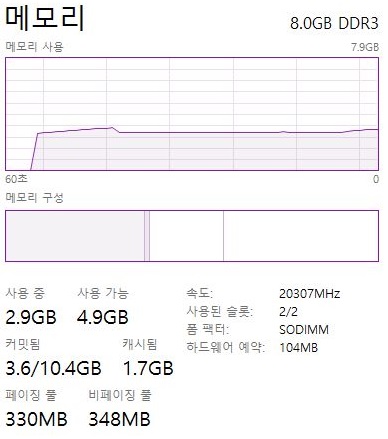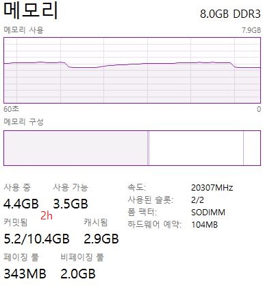 2시간이 지났어도, 위 스크린샷에서 볼 수 있는 것처럼 일단 적은양의 메모리를 계속해서 그대로 쓰고 있는 것을 볼 수 있습니다. 계속해서 메모리 사용량이 급증했다가 다시 감소하는 것을 볼 수 있습니다.