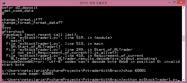 그런데 어떻게 된 것인지 모르겠습니다만, 일단 cmd상에서는 여전히 UTF-8을 언급하면서 유니코드 문제가 걸려서 전혀 해석을 할 수 없다고 합니다.