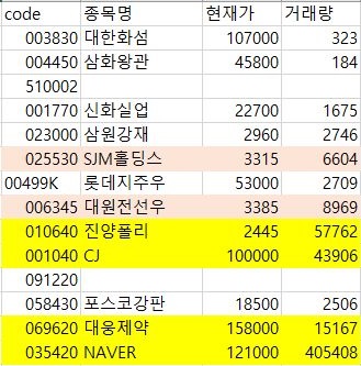 다음으로는 SecondClass에서 나온 것인데, 여기서는 충격적이게도 겨우 1개의 종목만이 모의투자 적합으로 나왔으며, 그나마 거래량을 줄여보니, 2개의 종목만이 더 추가가 되었습니다.