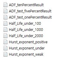 먼저 First클래스입니다. 여기서는 3개의 종목이 쓸만한 것으로 나왔지만, 문제는 평균회귀에 걸리는 시간이 커서, 얼마나 자주 거래가 일어날 지 의문이 듭니다. 그리고도 너무 나오는 양이 적어서 거래량이 1만에서 5000이상으로 낮게 잡아도 겨우 1종목만 추가할 수 있었습니다.