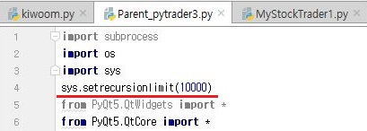 먼저 위 스크린샷과 같이 parent_pytrader3.py에서 sys.setrecursionlimit()라는 것을 설정해 주는데, 이걸 1만회로 더 올려 주도록 합니다.