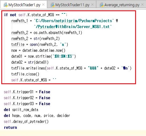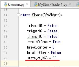그리고 나서 kiwoom.py로 가서, 위 스크린샷에서 나와 있는 것처럼 일단 클래스의 변수로 state_of_MSG라는 것을 공백처리 해 줍니다.
