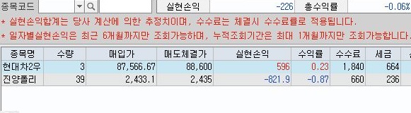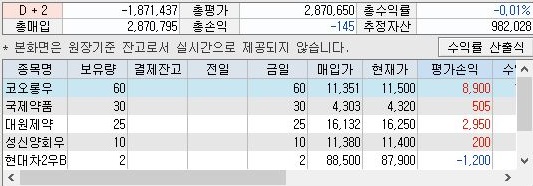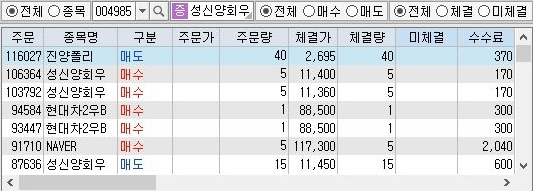 하룻만에 9500원을 넘는 수익이 나오는 것을 확인할 수 있었습니다. 이렇게 하면서 손해를 보는 경우는 상당히 적었는데, 일단 진양폴리 처럼 저가의 주식이 너무 많이 사서 매도할 때 미체결이 나올 경우 주문취소를 할 수 있는 기능을 구현하는 것이 급해 보입니다.