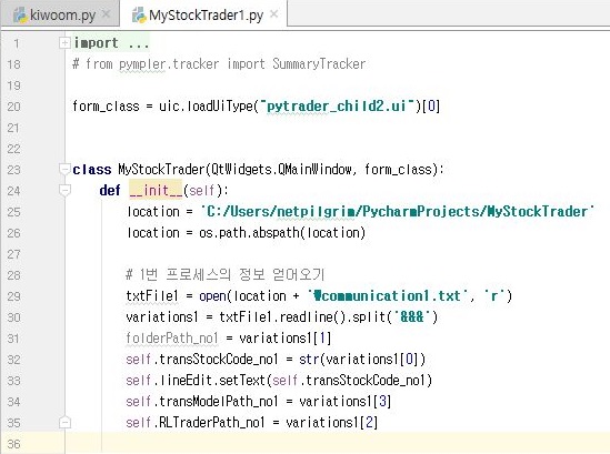 다음으로는 kiwoom.py를 복사해서 붙여넣기를 하도록 합니다. 일단 여기까지는 기존의 방식과 그대로 인 것을 볼 수 있습니다.