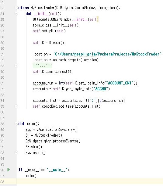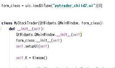 그리고 나서 빠지면 안되는 Kiwoom()을 선언해 주는 것도 잊으면 안된다는 생각이 듭니다. 이렇게 초기에 작동이 되는 메서드에 이렇게 지정을 하도록 합니다.