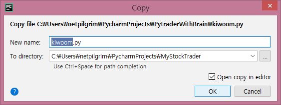 다음으로는 kiwoom.py를 복사해서 붙여넣기를 하도록 합니다. 일단 여기까지는 기존의 방식과 그대로 인 것을 볼 수 있습니다.