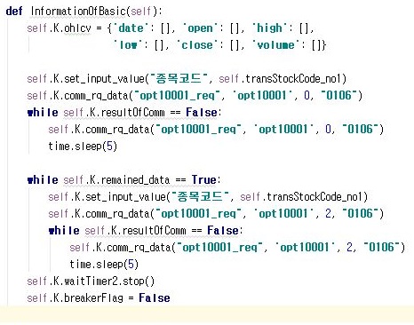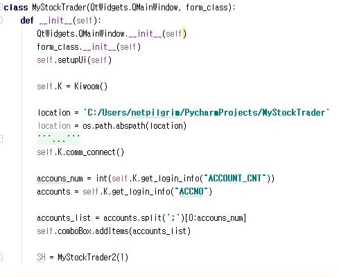 그리고 나서 다음으로는 두번째 클래스를 같은 py파일 안에서 생성해서, 여기서는 로그인을 한 이후에 나오는 작업을 예를 들면 어떤 종목의 현재가 같은 것을 가지고 오는 것에 대한 일을 처리하도록 합니다.